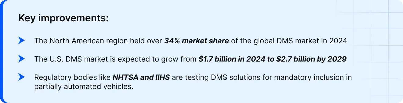 Upcoming federal mandates such as those under the Infrastructure Investment and Jobs Act (IIJA) are likely to push for mandatory in-vehicle safety tech. Early adoption of DMS puts fleet operators ahead of future compliance demands.