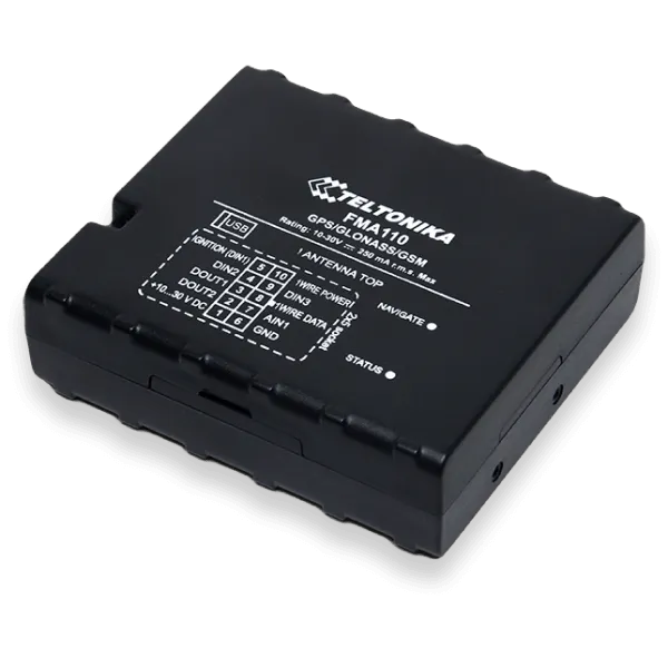 The Teltonika FMA110 functions as a tracking terminal, utilizing GNSS and GSM connectivity to gather device coordinates and transmit them via the GSM network to a server. Specifically designed for applications requiring the location acquisition of remote objects, it's noteworthy that the FMA110 is equipped with additional inputs and outputs, enabling control and monitoring of other devices on remote objects. Additionally, the device features a USB port for device status log output and configuration input.