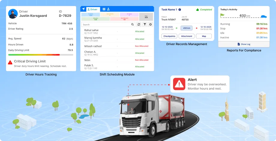Drivers’ work hours have rules—rest breaks, maximum shift time, etc. If these are not managed well, fleets face problems like driver fatigue, legal risk, and inefficiency. Trakzee’s shift-and-duty scheduling helps fleets plan work hours accurately, track actual hours, and ensure drivers are working safely and fairly.