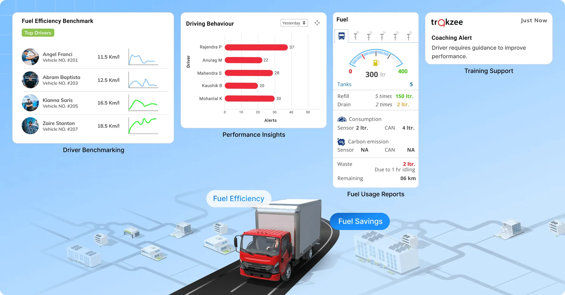 Drivers play a big role in how much fuel a fleet uses. Some drive in a way that saves fuel, while others may waste it without realizing. By comparing driver performance, fleets can set clear benchmarks for fuel efficiency. Trakzee’s Driver Benchmarking feature helps managers measure, compare, and encourage drivers to adopt fuel-saving habits.