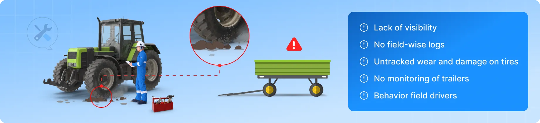 Agricultural fleets include tractors, harvesters, ploughs, and utility vehicles that operate across scattered farmlands. These vehicles are used seasonally but intensively, making timely maintenance and tracking essential. With large areas to cover and multiple machines in use, it becomes difficult to track asset usage, monitor field activities, or plan field-wise operations. Without proper tracking and logging, fuel gets misused, jobs are delayed, and vehicles are either overworked or left idle.