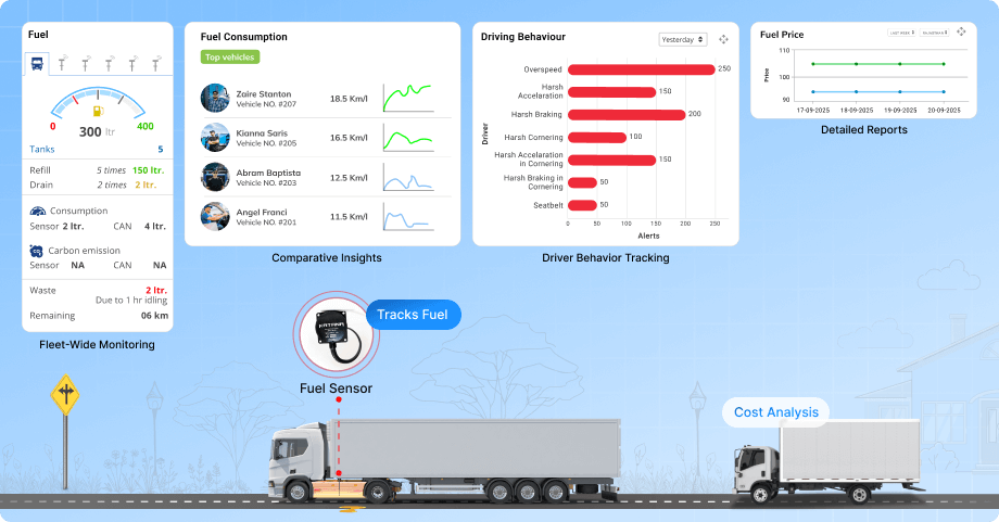 • Driver Behavior Tracking: Connects fuel usage with driver actions like harsh braking or idling.