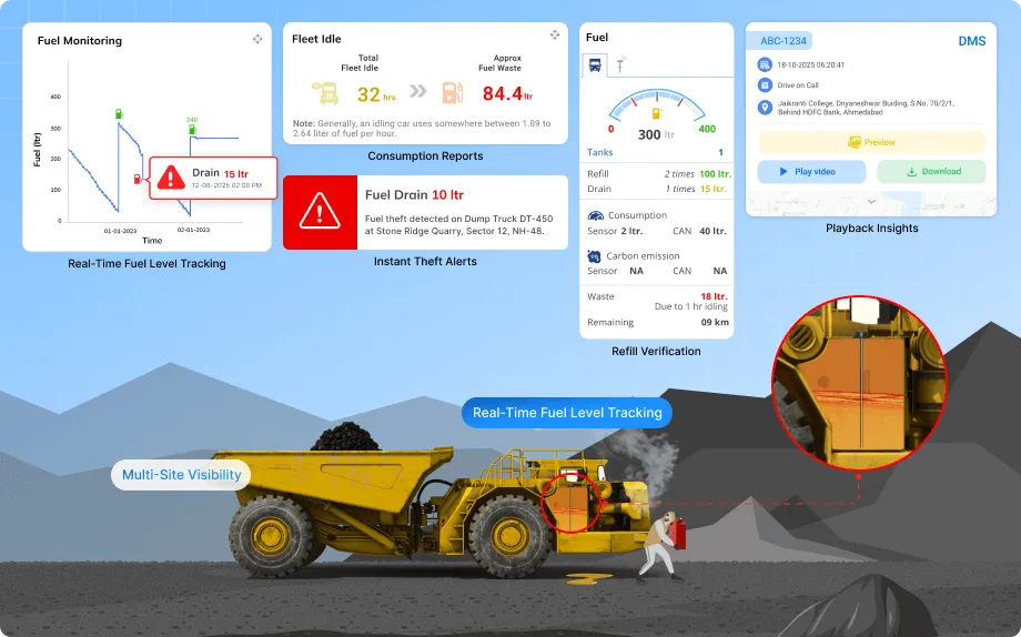 Trakzee, integrated with precision fuel sensors, offers mining operators a complete view of on-site fuel activity – from refills to consumption to theft incidents – directly through the platform dashboard.
