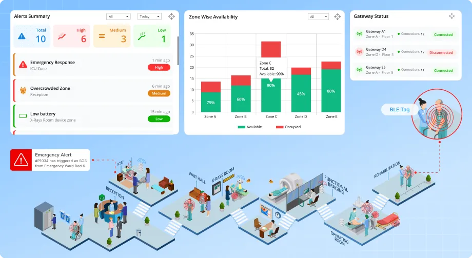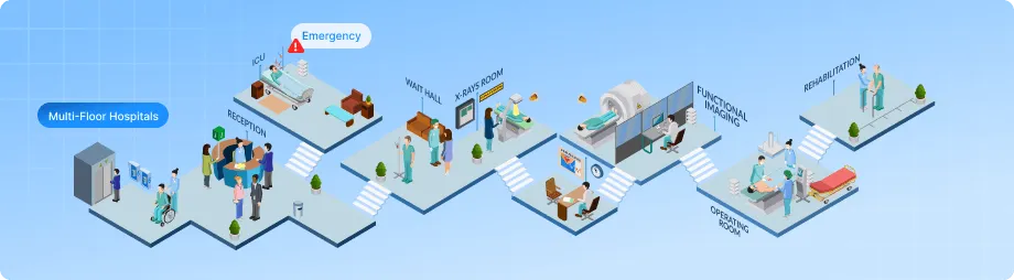 Hospitals and healthcare centers are high-pressure environments where safety, speed, and coordination are critical. With multiple departments, large staff teams, and constant patient movement, managing indoor operations in real time becomes a major challenge. These facilities demand systems that support continuous monitoring, faster decision-making, and seamless communication across zones.
