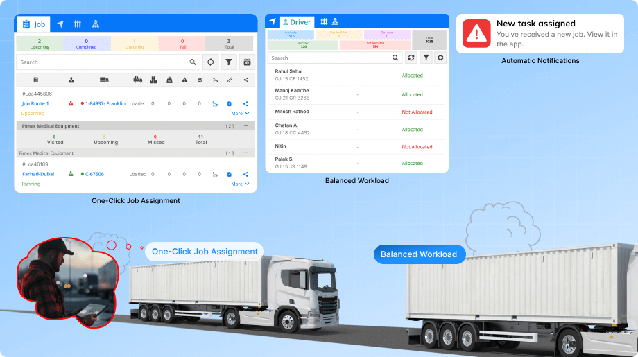 Assigning jobs to drivers or field staff can be time-consuming if done manually. With a one-click job allocation feature, managers can save time, reduce errors, and make sure tasks reach the right person instantly. This ensures faster response times, smoother workflows, and more efficient use of resources.