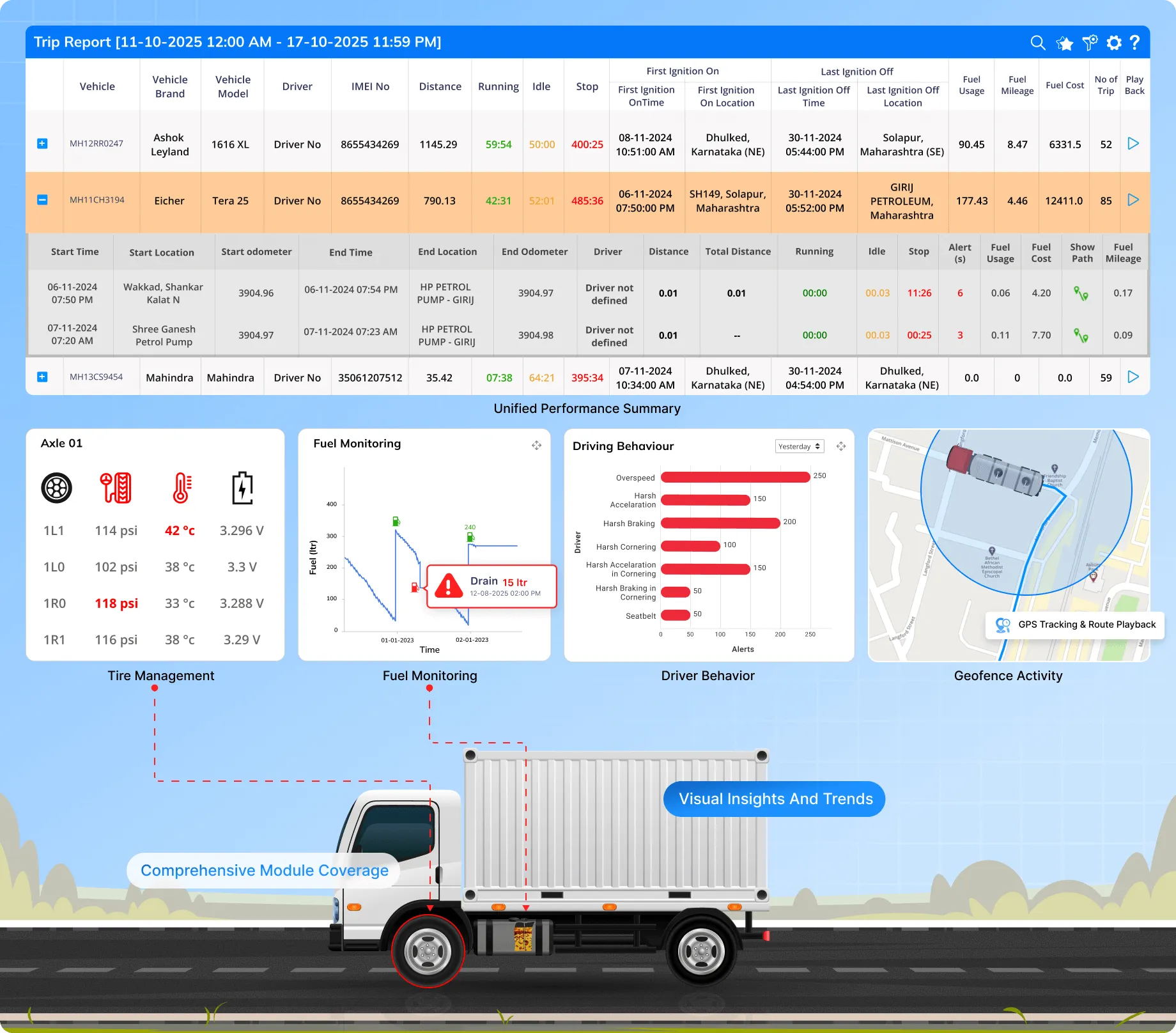 Every fleet operation produces hundreds of data points every day – fuel refills, tire changes, trips, driver behavior, alerts, maintenance logs, and safety incidents. But turning all that data into meaningful insights takes time and effort. Trakzee’s Weekly Automated Fleet Reports bring everything together into a single, easy-to-understand summary. Delivered automatically to managers every week, these reports provide a complete picture of fleet performance, expenses, and safety – without any manual work.