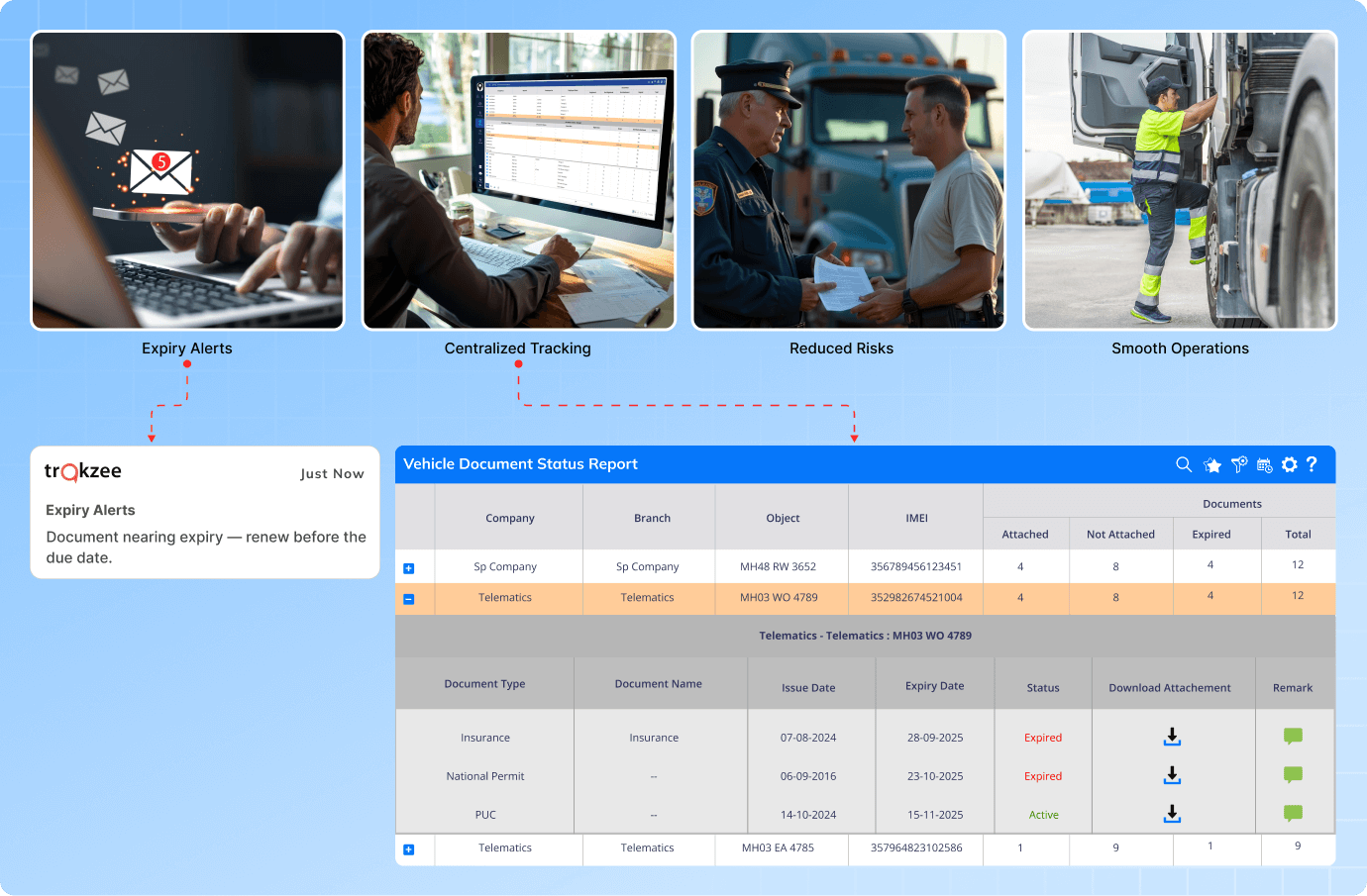 Automated Document Expiry Alerts are part of Uffizio’s Compliance & Maintenance solutions. They help fleets stay legally compliant by keeping track of important documents like insurance, permits, licenses, and certificates. This feature ensures no deadlines are missed, avoiding fines and penalties.