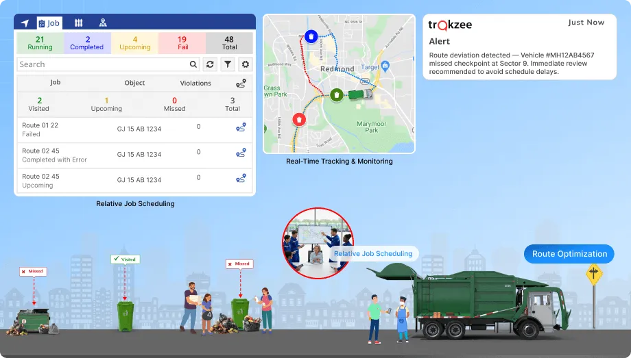 Various reports and analytics are also provided waste collection jobs, vehicles, and drivers to help identify areas for improvement.