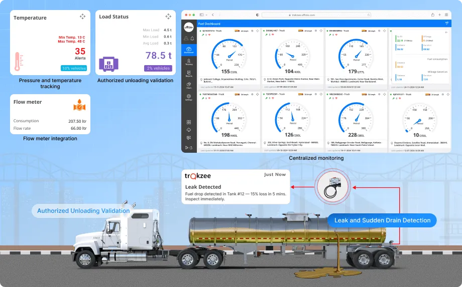 Trakzee integrates flow meters, fuel sensors, and real-time monitoring tools to detect leaks, track liquid movement, and verify delivery accuracy across tanker operations.