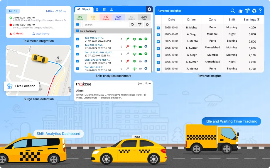 In the taxi business, every minute and every kilometer counts. Managing peak-hour demand, tracking driver shifts, and ensuring accurate fare calculation are constant challenges for operators. Manual logs and disconnected systems often lead to billing disputes, missed trips, and uneven fleet utilization. Trakzee’s Surge and Shift Analytics, powered by its intelligent Taxi Meter feature, transforms taxi operations with real-time visibility into performance, earnings, and demand patterns.