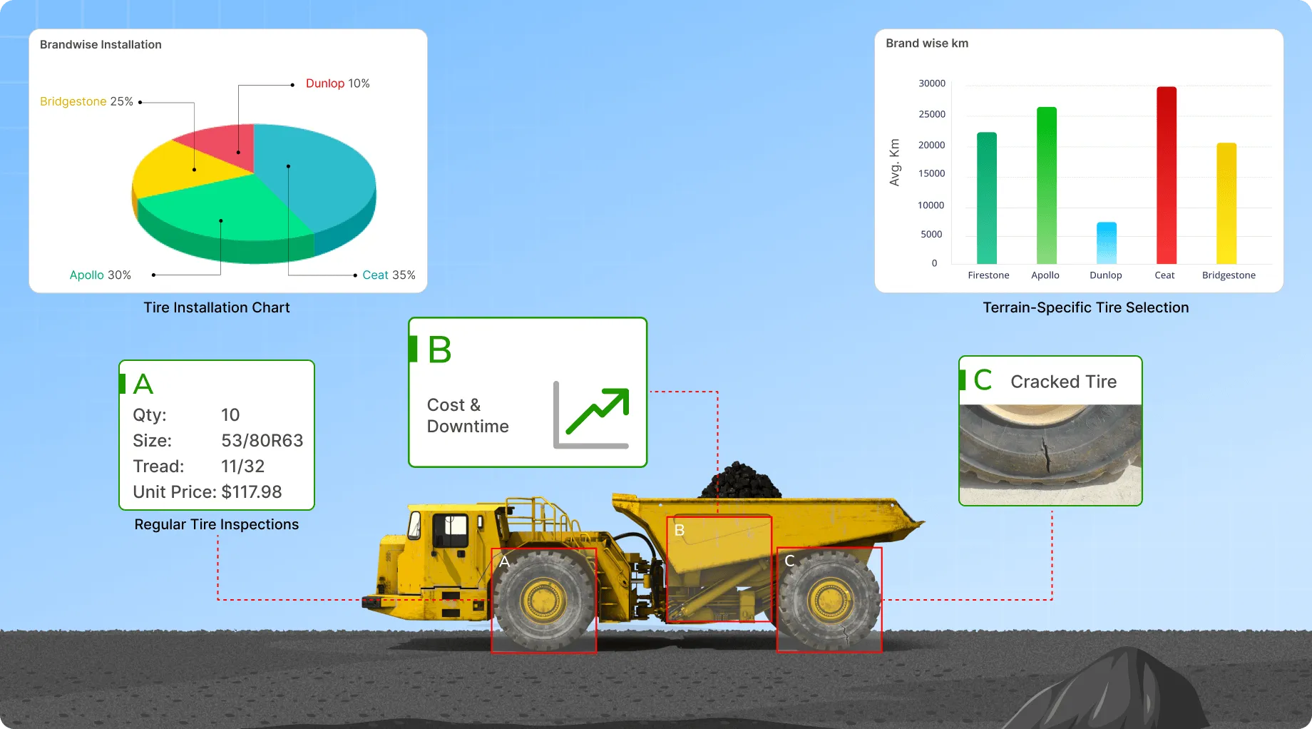 A mining company operates a large fleet of heavy equipment and manages a vast number of tires. This makes it difficult to keep track of tire performance and maintenance schedules. This can lead to downtime, safety incidents, and increased costs for the company.