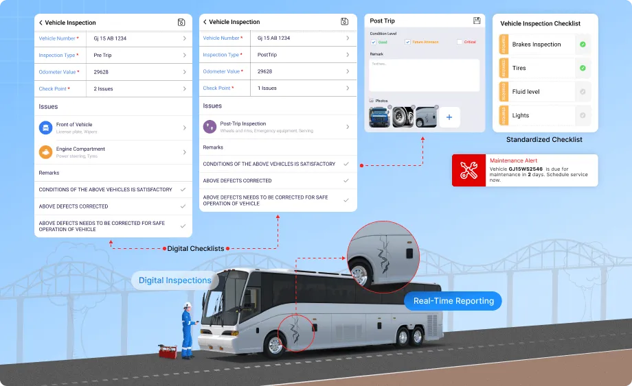 • Digital Inspections: Drivers use a mobile app connected to the software to conduct digital inspections. The app provides a standardized checklist and prompts for detailed reporting.