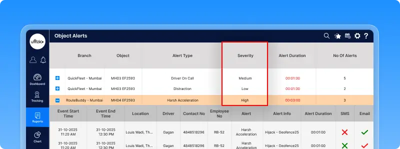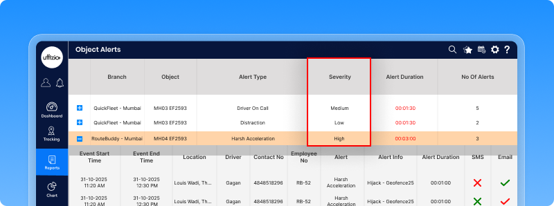 - The daily alert report automatically collects all live video alerts generated in a day and shows them in a single report including time, vehicle and driver name.