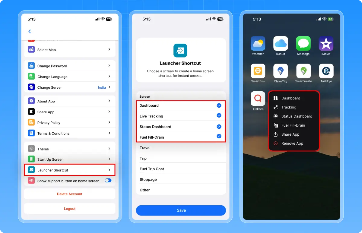 You can now set your favorite screens as shortcuts and access them directly from the app icon. Just long-press the Trakzee app icon, and your selected screens appear instantly. Tap and go — no need to open the app and navigate.