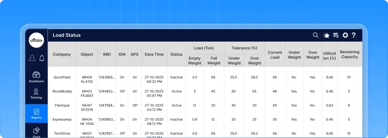 - Real-time load tracking: See the exact load of each vehicle using calibrated load sensor data.