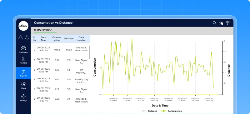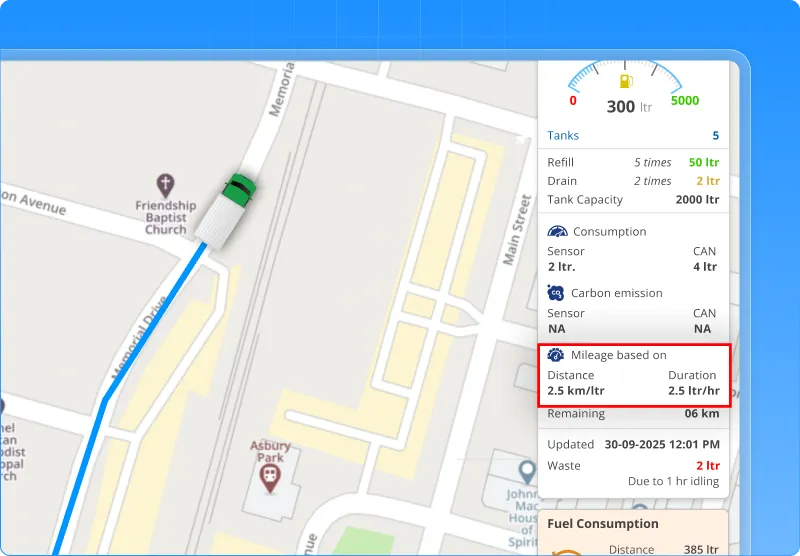 - Based on duration: Fuel consumed ÷ (Running + Idle Time) for efficiency tracking.