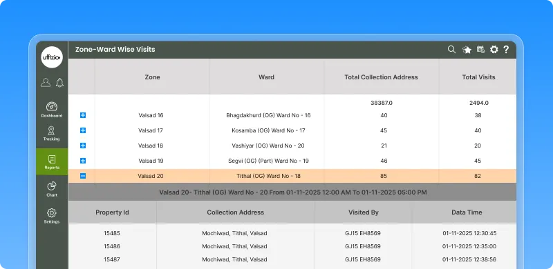 Supervisors and administrators can now measure daily waste collection coverage more precisely with the new zone–ward wise visits report. This enhancement brings analytical depth to field operations by correlating every collection address with real-time GPS data, ensuring full transparency in service delivery.