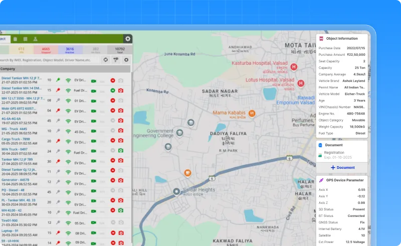 - Quick access widgets: View critical data at a glance with dedicated sections for object info, GPS device Info, and important documents.