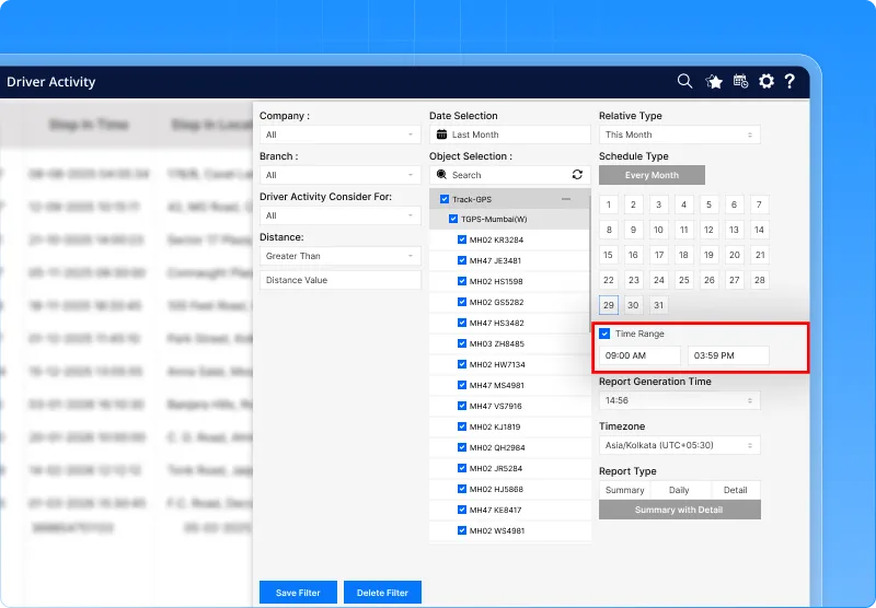 To make things easier, we’ve added a Time Range filter across all Driver Behaviour reports — including Driver Activity, Driver History, Driver Trips, Driver Work Hour, Driver Performance, Driver Rating, ADAS/DMS, and more.