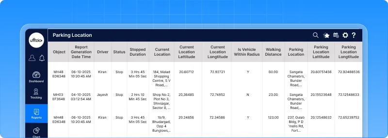 • Full details — current coordinates, speed, driver name, and parking duration.