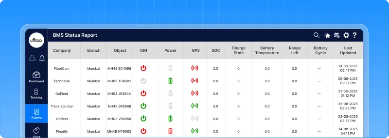 Filters make it simple to view data by company, branch, or vehicle, while real-time updates ensure you always see the latest status. You can even click on rows to dive deeper into specific vehicles. This report gives you a clear picture of battery health across the fleet, helping you plan better, prevent issues, and keep EV operations running smoothly.