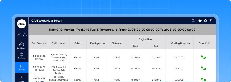 • See Start Engine Hour and End Engine Hour values for every trip in HH:MM format.