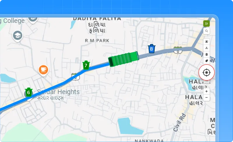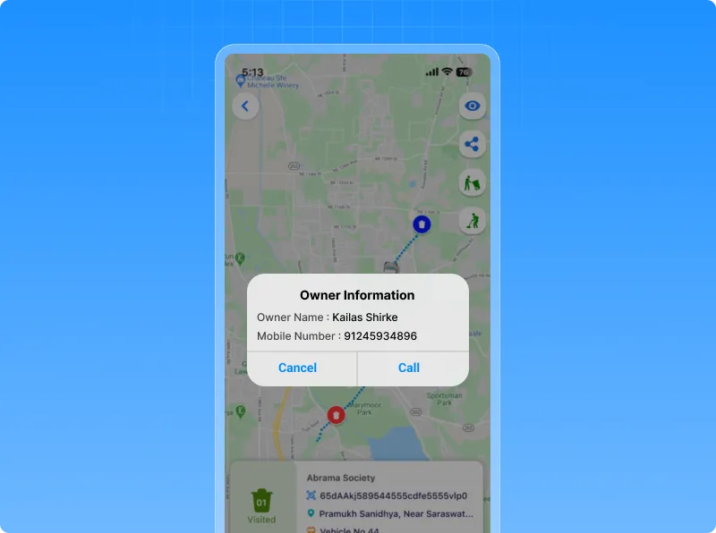 • Live Tracking (Bin Popup): When you click on a bin, you’ll see the owner’s name and contact number alongside time, vehicle, and address details.